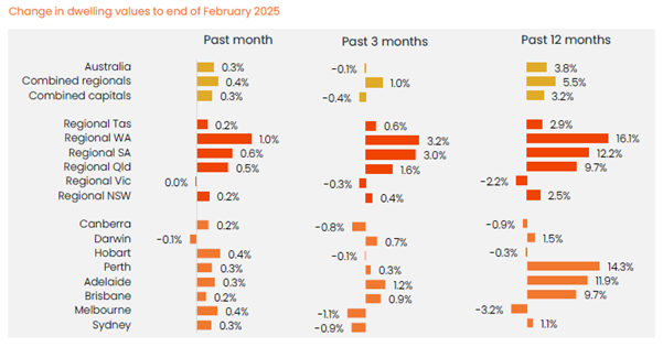 - Regional housing values rose by 0.4% in February, slightly outpacing capital city growth.