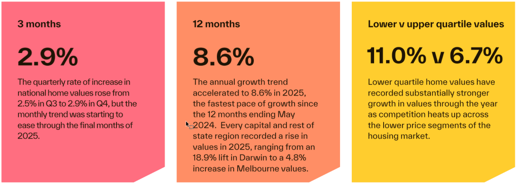 National dwelling values rose 8.6% over 2025, adding roughly $71,400 to the national median dwelling value. That’s not a flat year. It is one of the stronger calendar-year outcomes we have seen in recent decades, despite affordability and rate pressures in the system.