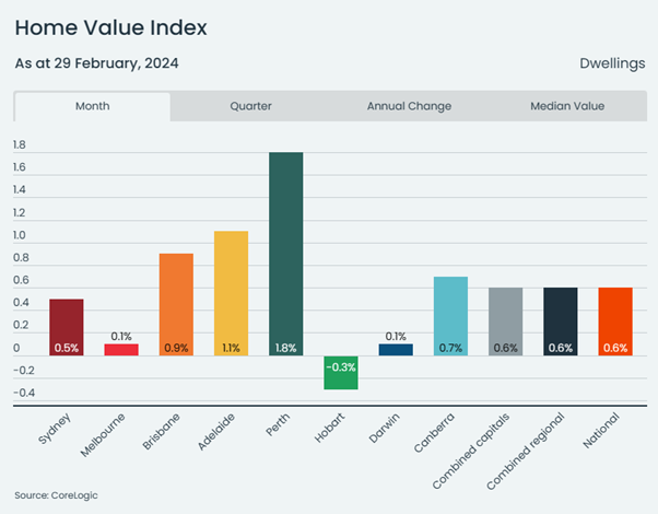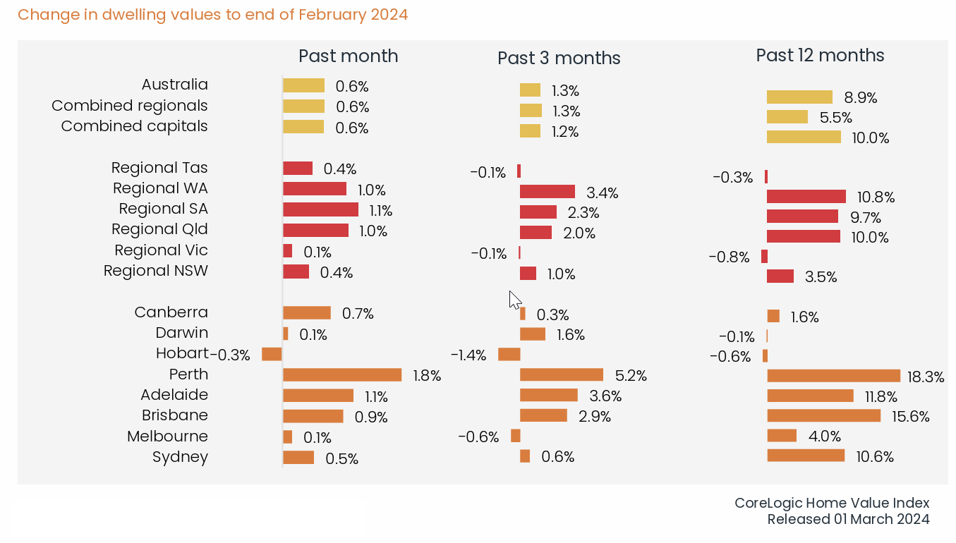 The HVI report shows that housing values rose broadly in February, with the national index up 0.6% over the month. This is the most substantial monthly gain since October last year, with a 20-basis point acceleration from the 0.4% increase in January. Each capital city and rest-of-state region recorded a lift in values over the month, except Hobart, where the market fell -0.3%.