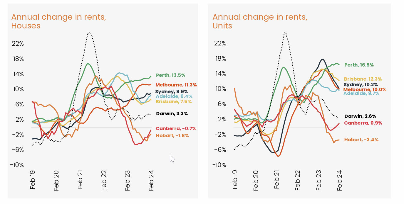 On the other hand, Hobart is the only market where values have declined over the month and the year, down -0.3% and -0.6%, respectively. Hobart’s housing market has been losing steam since it peaked in March 2022 and is now -12.2% below its previous high. Tasmania’s housing affordability has deteriorated significantly after a period of overperformance between 2017 and 2022, and the latest population data suggests a decline in interstate migration, which would also dampen demand.